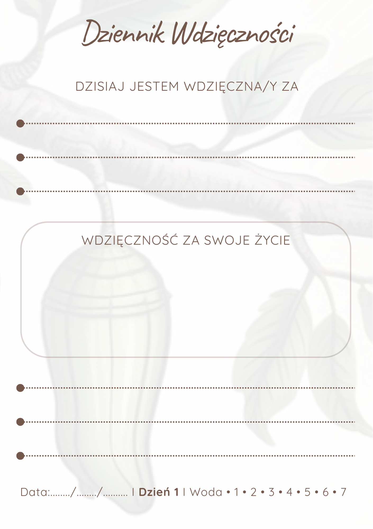 To fundament metody Justyny. Wierzymy, że "Strumień Wdzięczności" zaczyna się w ciele. Odwodniony organizm to zmęczony umysł, który widzi świat w szarych barwach. Pasek nawodnienia na dole każdej strony to Twój cichy pomocnik w dbaniu o energię życiową.